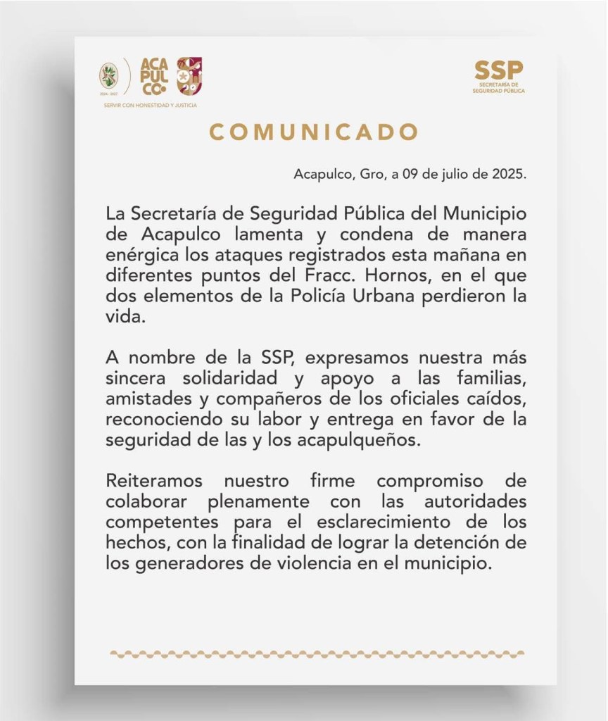 Redacción. En un día marcado por hechos violentos en Acapulco, la mañana del 9 de julio sumó otra tragedia: dos elementos de la Policía Municipal fueron asesinados en diferentes puntos del fraccionamiento Hornos. La Secretaría de Seguridad Pública municipal emitió un comunicado oficial donde lamenta y condena enérgicamente los ataques que golpean directamente a las fuerzas del orden.