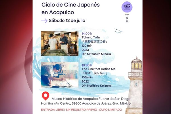 - Ciclo de Cine Japonés en Acapulco en el Fuerte de San Diego, exhibición de dos películas actuales japonesas. Entrada libre. Cupo limitado.