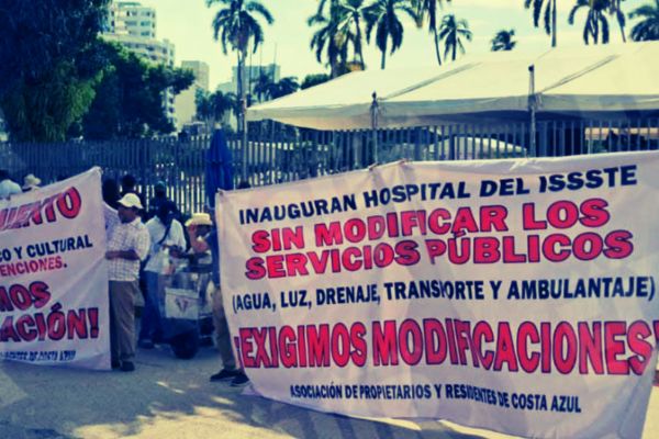 Mientras se desarrollaba el acto oficial, Trabajadores del Servicio Nacional de Salud Pública (SNSP) y vecinos de la colonia Costa Azul en Acapulco se manifestaron durante la inauguración de la primera etapa del nuevo hospital.