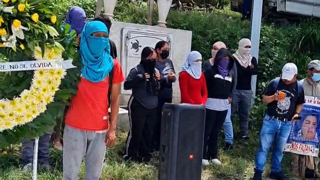 Todo en respaldo a la normal rural de Ayotzinapa y el colectivo Nos Faltan 43. Instalaron una guardia de honor ante las cruces de Alexis Herrera Pino y Gabriel Echeverría de Jesús, acribillados en el brutal desalojo policial del 12 de diciembre de 2011. Colocaron coronas de flores en el sitio exacto del horror, escalando su calendario de acciones por el 11 aniversario de la desaparición de los 43 estudiantes el 26 de septiembre de 2014.
