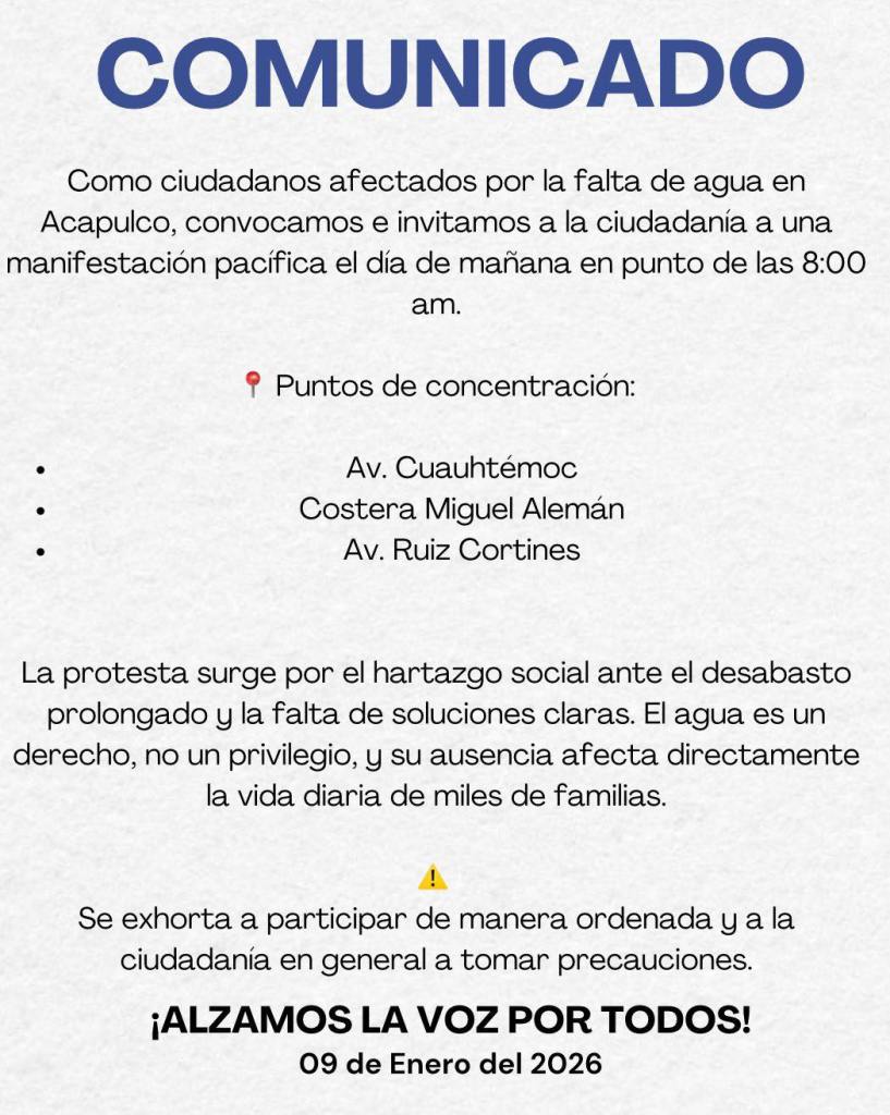 Redacción / Acapulco. Un comunicado que circula en redes sociales convoca a una manifestación pacífica este 9 de enero de 2026 a las 8:00 horas, con puntos de concentración en Av. Cuauhtémoc, Costera Miguel Alemán y Av. Ruiz Cortines.